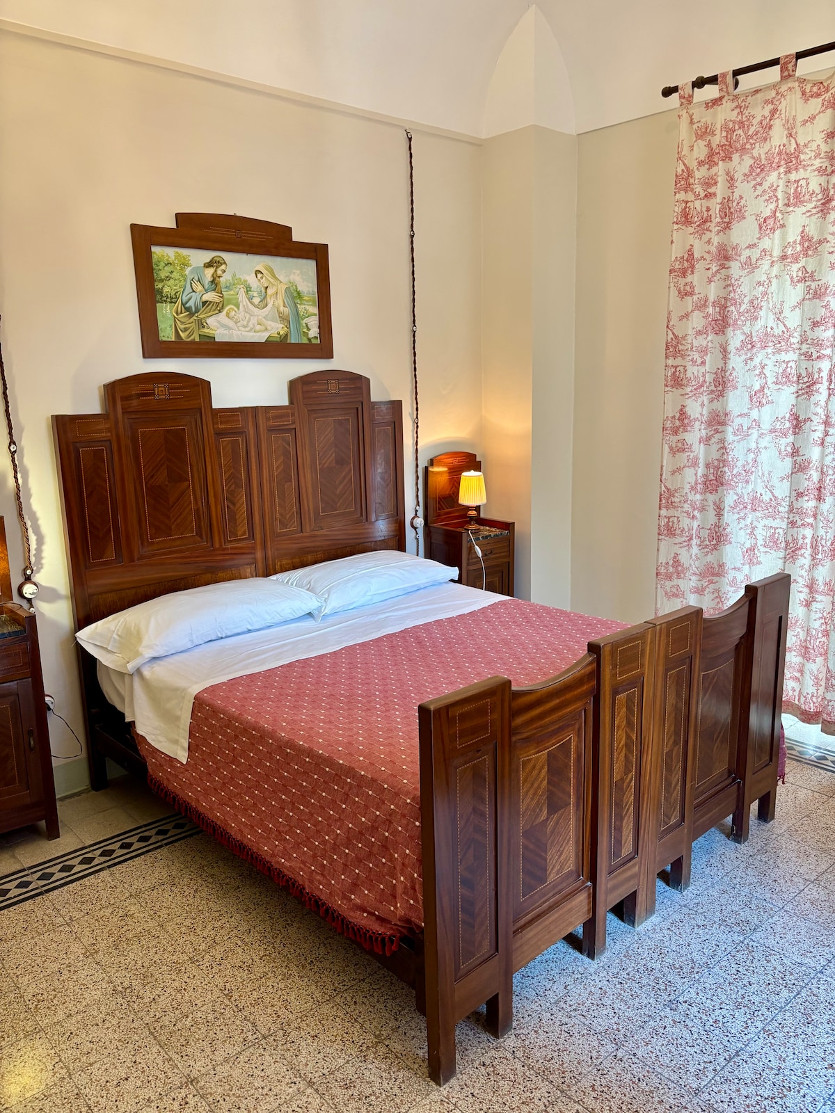 "Minerva" double suite – A refined room with a king-size bed for maximum comfort, equipped with an en-suite bathroom with shower, for a relaxing stay. Possibility of adding a single bed given the spaciousness of the suite. View of the valley, the twin mountains and the centuries-old park of the villa.