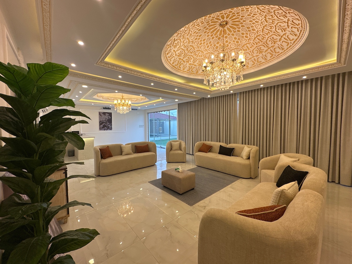 Relax with the whole family or friends at this 3-bedroom peaceful place to stay. Furnished patio & terrace with gas fire pit operational in winter, projection media room with Netflix, STCtv, Shahid vip tv, indoor heated swimming pool operational only in summer, two family rooms, full kitchen, washing machine, 4-full bathrooms, free 8-car parking, driver private room with kitchen & bathroom.