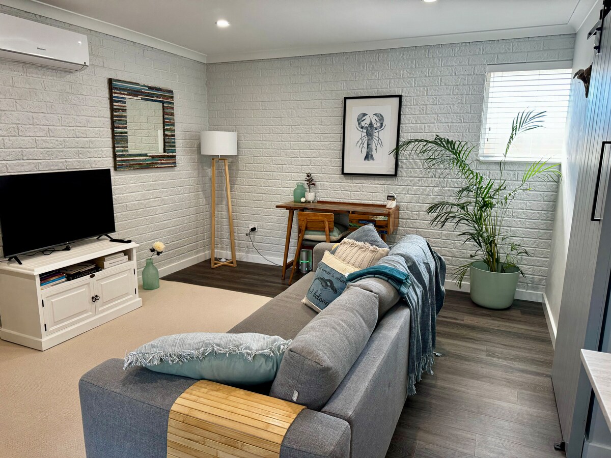 A quiet and private home. The living areas are filled with natural light a feature high ceilings adding to the spaciousness. It is equipped with modern fresh colored furnishings to give a holiday and relaxed vibe. Make a coffee and unwind on the couch , watch a movie or relax on the double day bed with a book or work at the desk. Sit outside the courtyard and enjoy the ambience. There is a fully equipped kitchen with all appliances to make entertaining a breeze.
