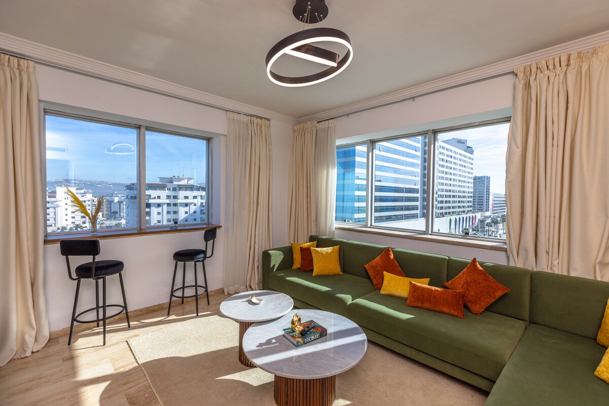 Welcome to our brand new two-bedroom apartment located in a prime area of Tangiers. This upscale property is situated in one of the most sought-after areas in the city with 24-H concierge & is only a 10 min walk from the Train Station, City Centre Mall, Ibn Battuta Mall and beaches. It offers both convenience and luxury at your doorstep. Private parking available. The apartment boasts: fibre optic WiFi, an option for chauffeur and a Moroccan breakfast prepared by our governess (additional cost)