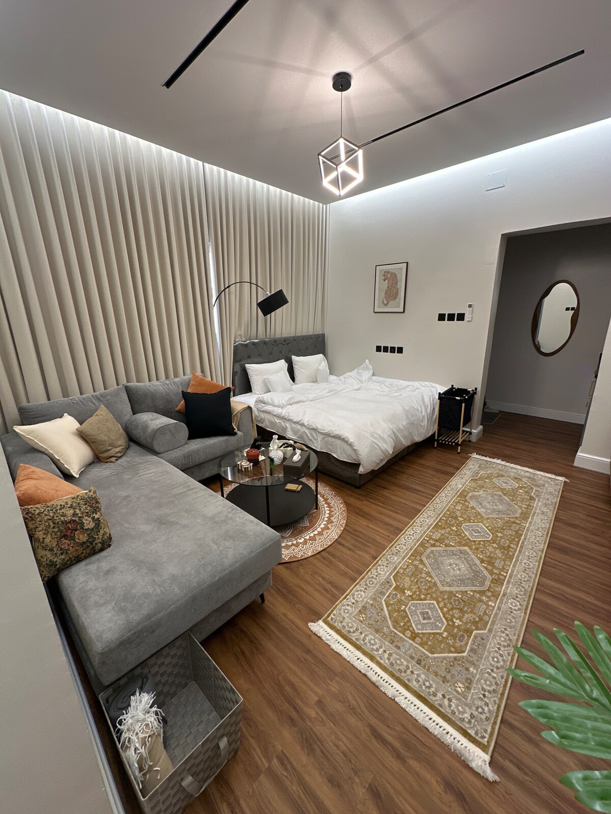 Welcome to this upscale room designed with modern taste and high luxury that combines elegance and comfort in every corner and provides you with an ideal stay experience, whether for one night or for a longer stay, a comfortable double bed with dim lighting under the bed that adds a touch of warmth and beauty, a large window that adds wonderful natural lighting, a smart and large TV, and a split air conditioner The room is designed in a calm and comfortable style, with beige and gold colors and warm wooden touches. The lighting is carefully designed to suit different times: a bright morning or a quiet evening, suitable for couples, solo travelers or even business visitors.
