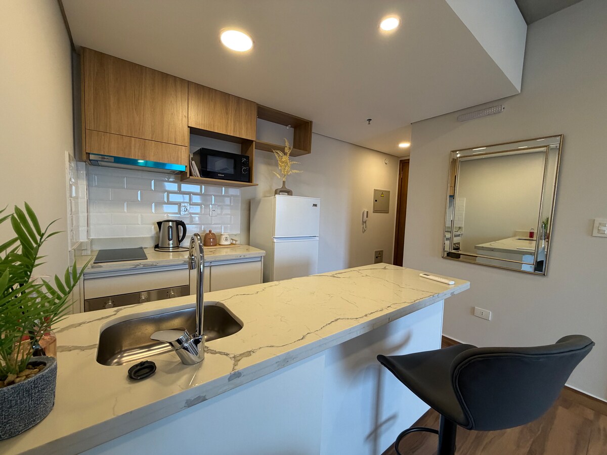 Brand new apartment in a luxury building. It has 40m² of its own, with Smart TV, WIFI, and in the building you have all the amenities: Swimming pool, air-conditioned Quincho with grill, children's playroom, equipped gym, etc. It is a 5-minute drive from the capital's most valued corporate center, and a 25-minute walk. It is also an 11-minute drive to Silvio Pettirossi Airport It has a double bed + a sofa bed. In total, up to 3 people can sleep.