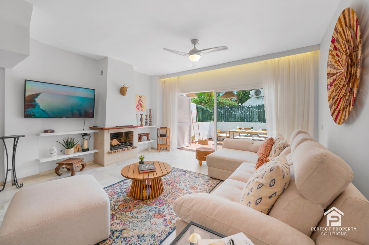 Have fun with the whole family at this stylish place 🌞🌴 This beautifully designed two-bedroom garden apartment in Cortijo del Mar is full of style and charm. Perfect for families and couples, it offers a quiet and safe retreat with a sunlit terrace, modern décor and ultra-comfortable beds. Fantastic location, just a 8 minute drive from Puerto Banús ! Restaurant and the pool are open from April to October.