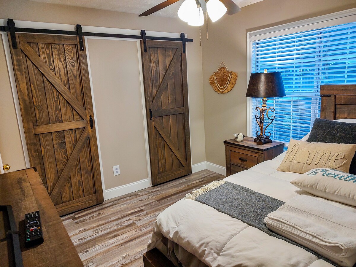 2 bed 2 bath, washer & dryer. Full kitchen(dishwasher, ice & water maker) & dinning room with all supplies, free coffee, full Living room with 85” inch 4k TV. Master bedroom has 75” 4k TV & king size bed. Guest bedroom has a queen bed. There are 3 outdoor private patios with furniture. Fenced in dog fence as well. The house is all one level & Workspace with high speed internet.