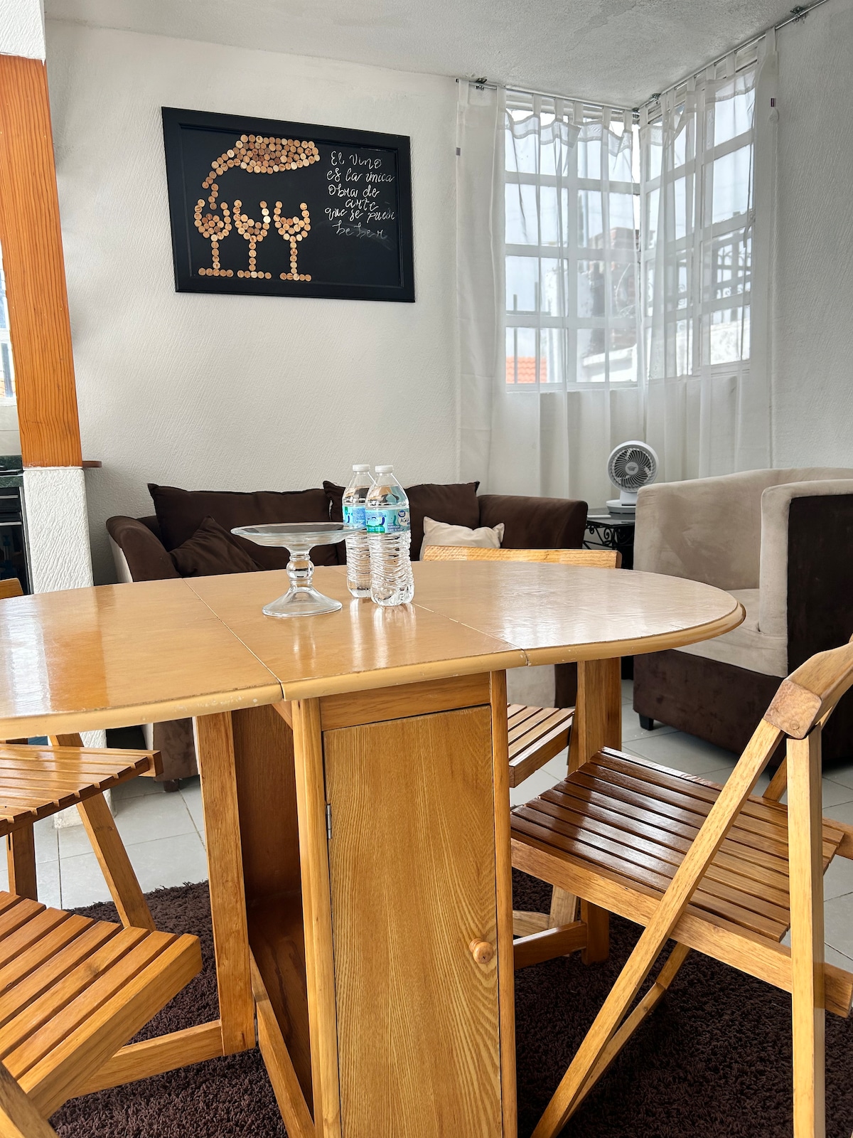 Enjoy this beautiful house detailed in wood, well lit, ideal for 1 to 6 people, in a quiet and family area. Ground floor: garage for one car, living room, dining room, bar, full bathroom, equipped kitchen, patio with barbecue. Upper floor: master bedroom with 1 double bed, 1 comfortable sofa bed, 2 large closets, full bathroom, second bedroom with 1 double bed and spacious closet, plus a study for working. Just 15 minutes from downtown Tlaxcala and 5 minutes from a shopping mall.