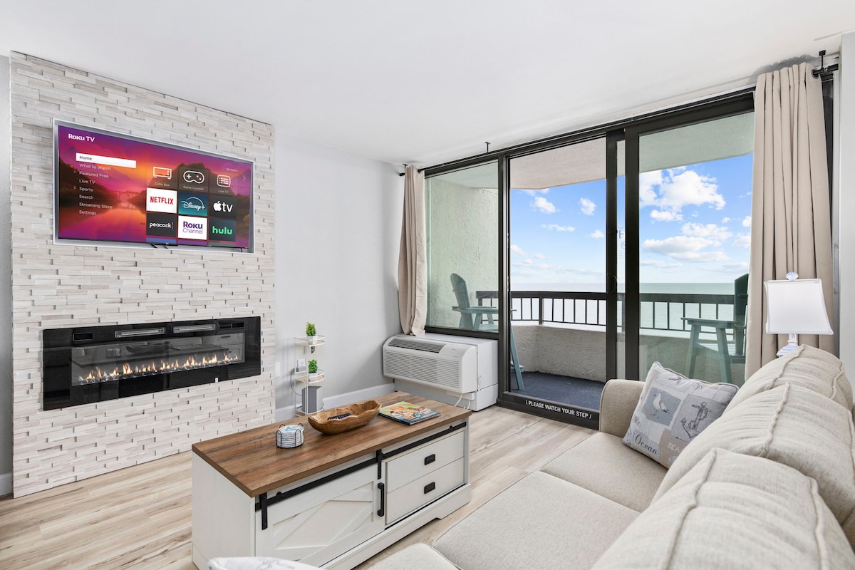 SUMMER IS HERE. DON'T MISS BOOKING YOUR STAY!!! Experience breathtaking ocean and sunset views from our Super Clean, 5-star rated condo on the 9th floor. "OCEAN VERDE" is a spacious 1-bedroom layout with a king size bed, full kitchen, large balcony, smart TVs and a fireplace. Washer\dryer located inside the condo. Located in a prestigious area of Myrtle Beach known as the Golden Mile, minutes away from restaurants, shopping, and attractions. Book Now for the ultimate MB getaway!