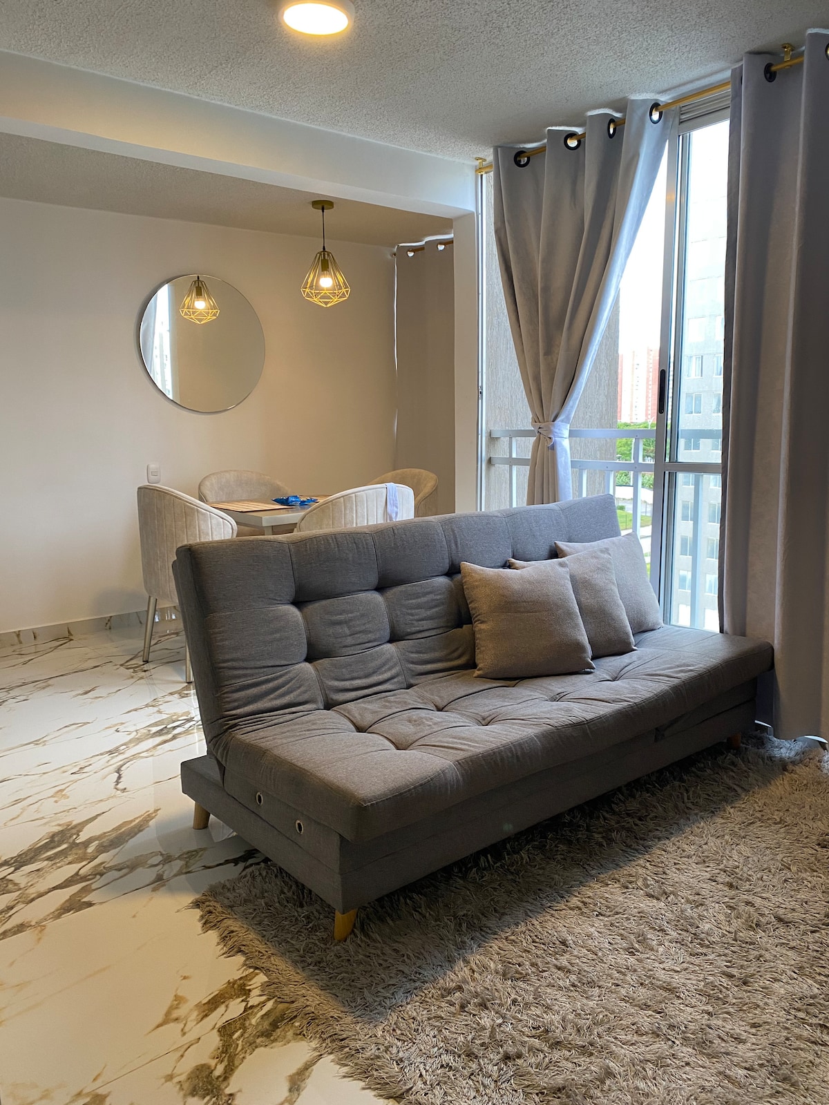 Comfortable and beautiful apartment with 2 bedrooms, each with a closet, private bathroom and AC. Main bedroom with double sofa bed (another double bed underneath) and the secondary bedroom with 2 single sofa beds (another 2 single beds underneath). Fully equipped kitchen. Living room and study with AC. High-speed Wi-Fi and cable signal. 3 Smart TVs. Building with a swimming pool and gym. Safe area. Please note that you must send your documentation prior to check-in (Colombian laws).