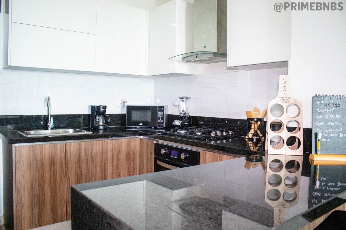 Enjoy an unforgettable experience in this modern loft-style apartment on the 9th floor of GZ Tower: * Flexible check-in and check-out *900 Mbps WiFi *1 block from the Ibero-American clinic and 3 blocks from the Viva Mall. *1 bedroom with queen bed and A/C. *A living room with a sofa bed and air conditioning. * Washer/Dryer *Smartfit gym nearby (additional charge). *Free private parking * Ideal location: Close to shopping centers, major clinics and tourist areas.
