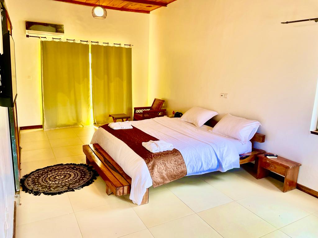 Spacious bedroom, delicately decorated with details that highlight the know-how of Beninese artists and craftsmen. In addition to the comfort of the room, you benefit from a large dressing room, a shower with a mosaic wall, a television, and unlimited internet access.