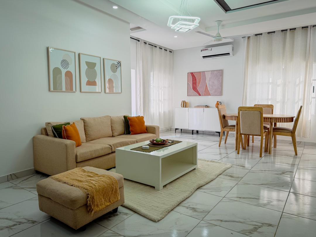 Welcome to this modern and spacious studio apartment in Cotonou— your perfect home away from home in a quiet, safe neighborhood. Enjoy a fully equipped kitchen, a cozy living area with comfy sofas and a smart TV, a dining table, and a private bedroom and bathroom. The space is bright, clean, and thoughtfully designed for relaxation or work. This beautiful appartment is pnly a short drive from the airport, it's close to upscale restaurants in Haie vive and also near supermarkets and shops