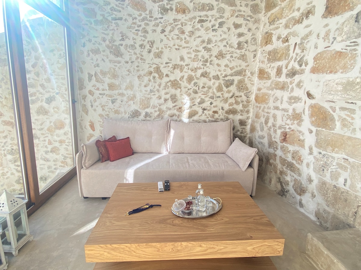 An elegant and cozy beachfront stone Villa with the unique views of the sea is perfectly located at Petres, just a 15 minute drive from the city of Rethymnon and a 35 minute drive from the city of Chania. The accommodation is perfect for couples or a family, the fully equipped kitchen, the luxury bathroom, the modern living room as also the stanning view will fulfill your high expectations.