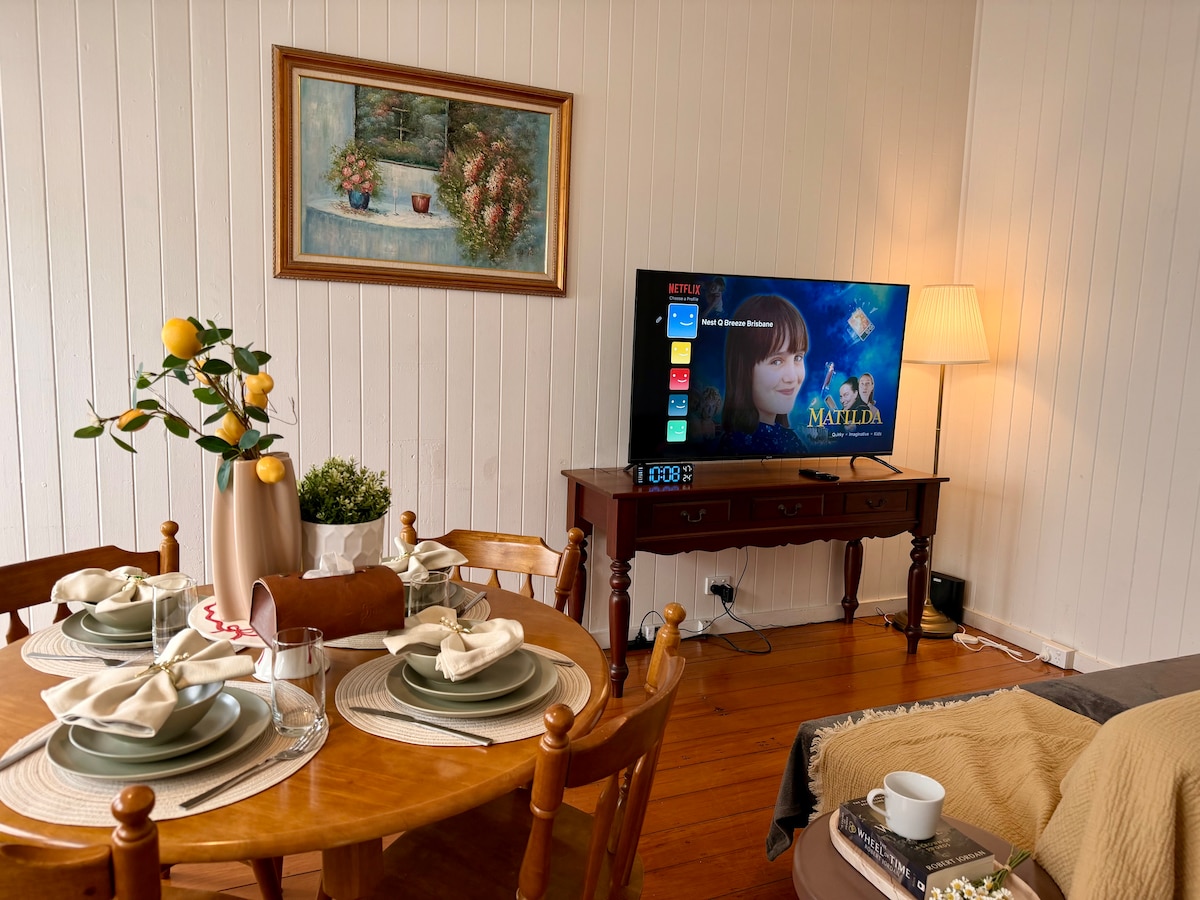 Soak your cares away in the private outdoor hot tub, nestled on your own leafy deck. This peaceful studio sits quietly behind our 112-year-old Queenslander — a hidden gem just 100 metres from Wooloowin train station. Step inside through French glass doors to a spotless, modern studio complete with everything you need: • A private deck with spa • A fully equipped kitchenette including coffee machine • Hair dryer • Off-street parking for peace of mind • Pet-friendly for one sml doggie