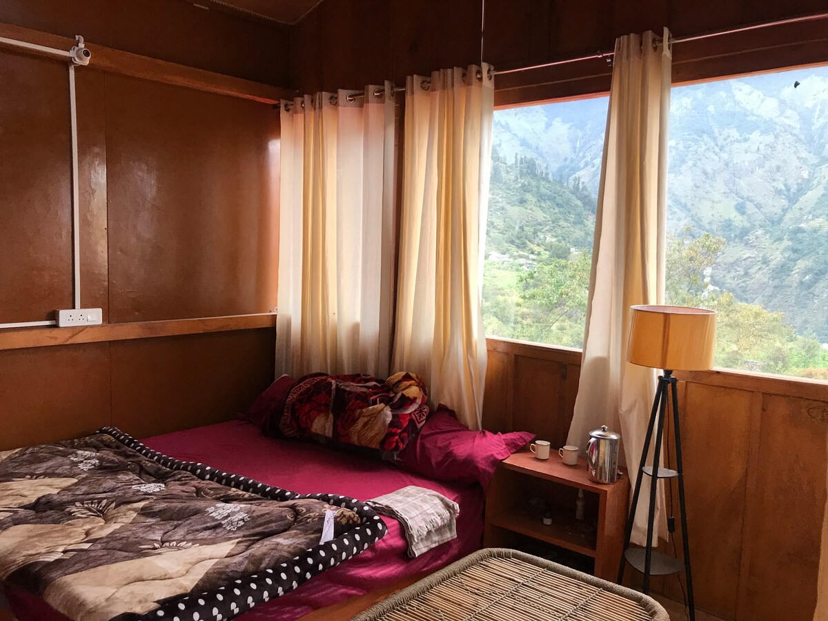A hand-built mountain home at 2,400m — where the road ends and the Himalayas fill every window. Architect-designed villa with glass walls, wooden interiors, and snow-capped peaks from your bed. Every beam carried up by hand or mule — built the old mountain way. Reached via a 25–30 min uphill trek from the parking point — a proper mountain trail, not a flat walk. Plan accordingly if travelling with seniors or young children. Horses available on request.