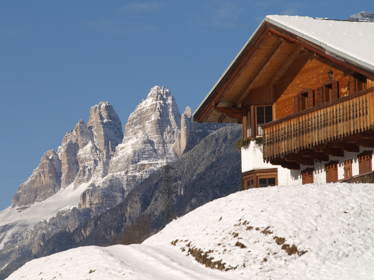 Typical mountain house, centrally located a few hundred meters from the main square of Auronzo di Cadore and next to all services (shops, church, museum, public transport) but, at the same time, in an isolated position at the edge of a forest of centuries-old fir trees. Set on a raised hill, it dominates the whole town and enjoys an excellent view of Tre Cime di Lavaredo and the most famous peaks of Sesto Dolomites that surround the town.