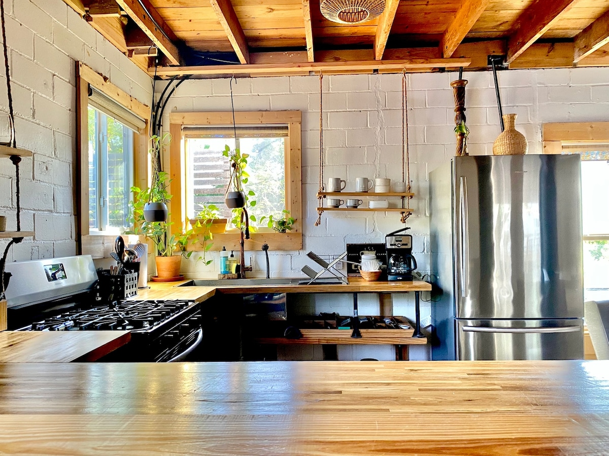 Recharge after your Austin adventures at this quirky-cool creekside cottage—where rustic charm meets comfy luxury! Tucked away in an urban oasis, this cozy spot has all the vibes. The dreamy bedroom overlooks the creek and features the comfiest queen bed ever. Got an extra guest? The pull-out chair becomes a twin futon! – Quick Uber to downtown – Full kitchen for foodie fun – Walk to awesome local eats – Guidebook of our fave spots – Two bikes for cruising – Free snacks & coffee, of course!