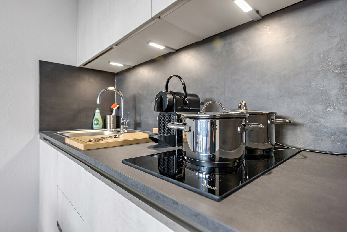 This stylish studio offers peace, comfort, and excellent connections. The cozy winter garden with views of the Wertach invites you to relax all year round. The apartment features a fully equipped kitchen with a Nespresso machine, Smart TV, and Wi-Fi. Tram (450 m) and bus (240 m) stops are within walking distance, and Königsplatz is 4.3 km away. Free street parking, a riverside walking path, restaurants, and a supermarket are nearby.