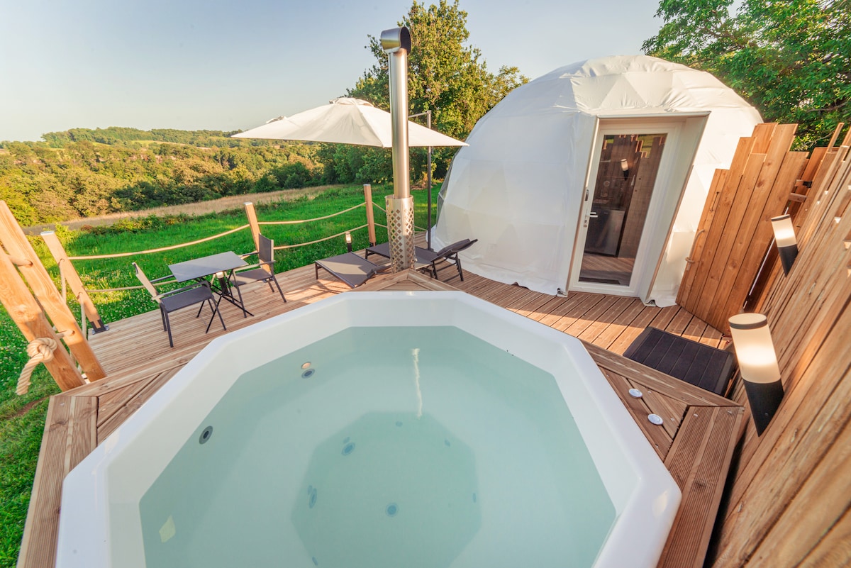 In the middle of the Lot countryside, a few minutes from the Padirac chasm and the city of Rocamadour. We offer our dome to be as close to nature as possible with all the comforts of a suite. Ideal for a romantic night, our wood-fired Nordic bath will allow you to enjoy the calm of the surrounding nature