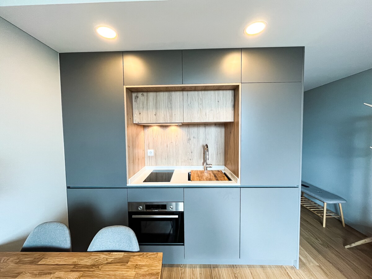 Modern studio located in the Centre of Aveiro. 1min from the train station and 10 min walk from the canals and moliceiros. Flat with all amenities, including private garage and balcony with dining and living space. Possibility of placing baby cot or mattress for children up to 10 years without extra charge.