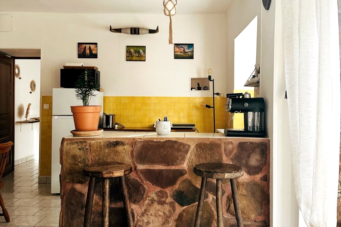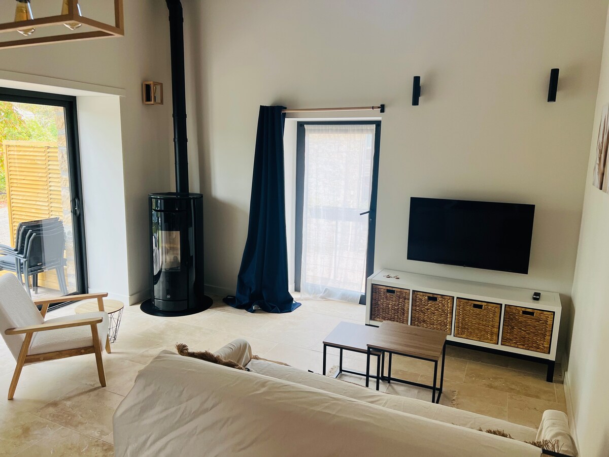 Welcome to our gîte, a true haven of peace in the heart of nature, for a stay combining sport, cultural discoveries and rest. This independent T2, carefully renovated in a wing of our house (independent access) combines authenticity (stone, wood, warm atmosphere) and modern comfort. It includes: • a cozy bedroom with double bed, • a private bathroom, • a bright living space with equipped kitchen, pellet stove • a private terrace with countryside views.