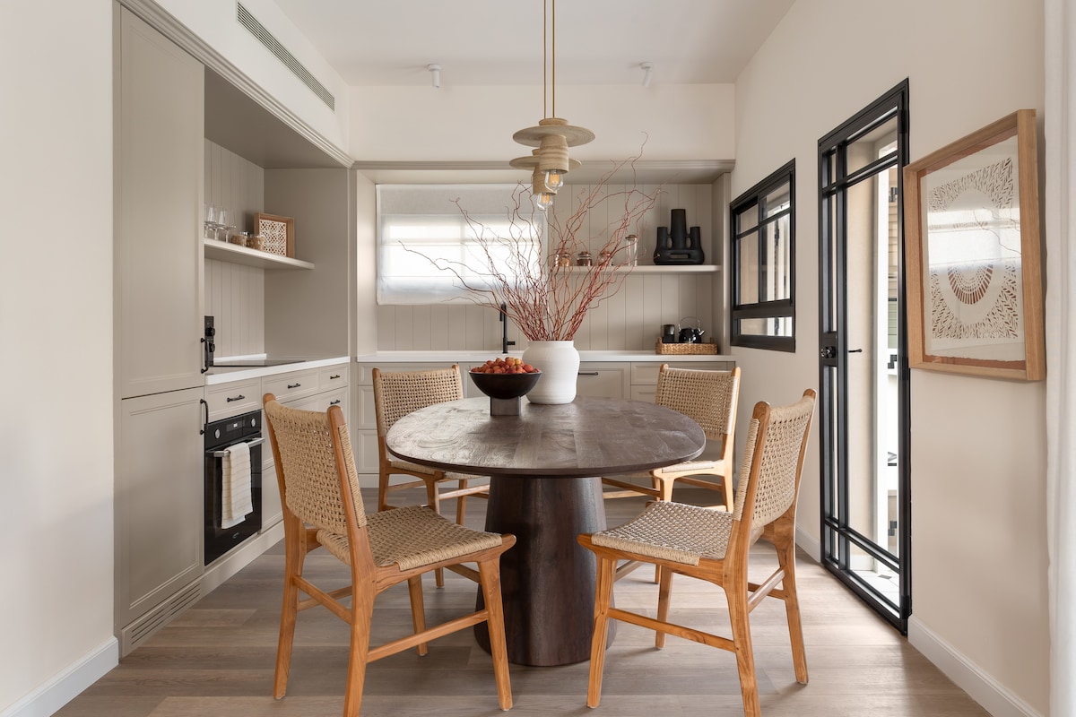De Green Suite takes inspiration from the urban nature of the city and Shenkin Street. Its shades of green and bright colors create a serene and peaceful atmosphere, with a view of the beautiful Shenkin Garden visible from its windows. special artistic touches were commissioned, The suite includes one bedroom with satin bedding, equipped kitchen, dishwasher, refrigerator, espresso machine, smart TVs, luxurious bathroom , advanced air conditioning, safe. PRIVATE SHELTER IN THE BUILDING