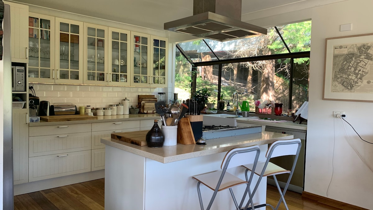 Perfect for lovers of the ocean. Just a 5 minute stroll to the beach, cafes and shops - this unique, colourful, multi-levelled beach house - set amongst the trees in a beautiful garden with waterfall and amphitheatre offers the best in location, comfort and artistic charm for your holiday. Hosting up to 2 people in the Beach Hideaway, with its leafy entrance, looking over the lush sub tropical gardens , this is a truly unique getaway for lovers of nature, art and beauty .