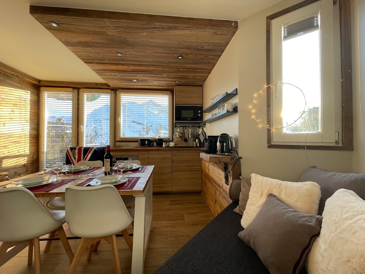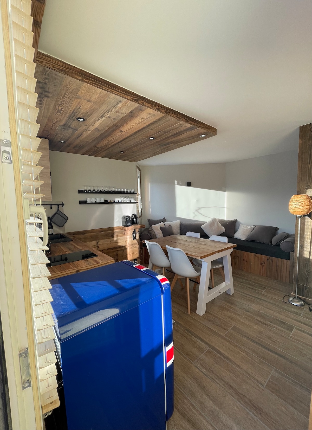 Bright 25m2 apartment for 4 people completely renovated in 2026 by an architect Ideally located in Avoriaz opposite the Prodains Express cable car, 20m from the ESF Ski-in/ski-out 2nd floor with an elevator Details: - Entrance (cupboard, washing machine) - Equipped kitchen (hotplates, oven, microwave, dishwasher, fridge) -Dining area - Mountain room/corner with bunk bed 80 x 190 - Living room with sofa bed 140x190 - Bathroom (toilet, shower) -Balcony - Ski locker