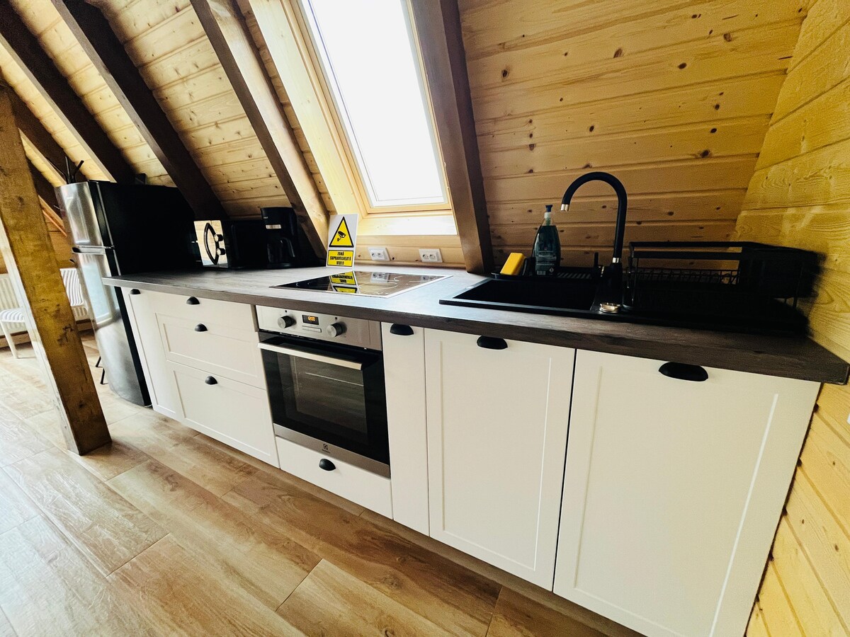 This is our first chalet, built in 2021. It has a Swedish inspired architecture, with modern finishing and very bright interiors. The front terrace has an astounding overview of the entire Fagaras Moutains ridge and just in front of the terrace, 5m away, there is the lake. Inside there are two bedrooms, each with a queen bed. Outside the bedrooms there is a open-space kitchen and dining area with view towards the moat and the lake.