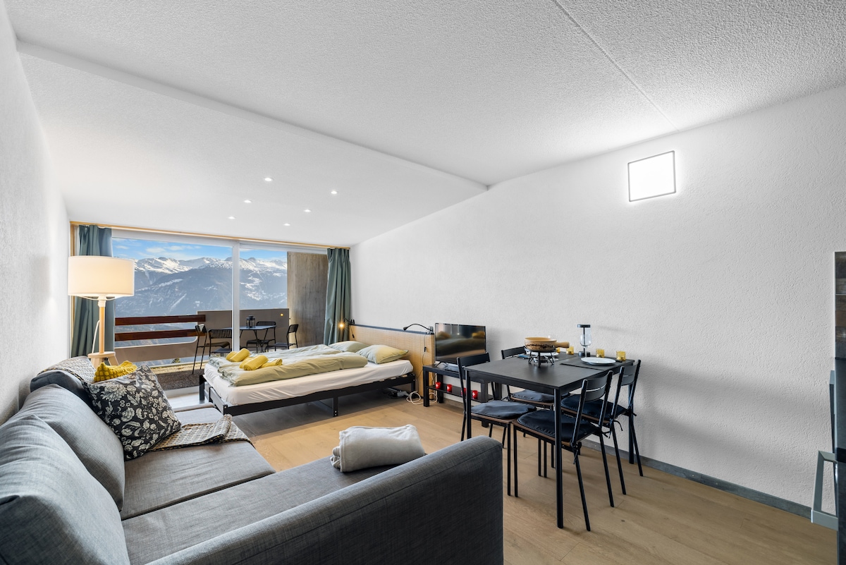 Enjoy a stylish and central home. 25 m2 studio ideally located on the village square in Anzère. Ski-in ski-out. The studio is equipped with a balcony and is located at the foot of the slopes. It is located in the heart of the "Le Zodiaque" residence, including its "Au Chalet" restaurant and its "Le Soleil" bar with panoramic views of the Alps. These restaurants are available for eating IN or takeaway.