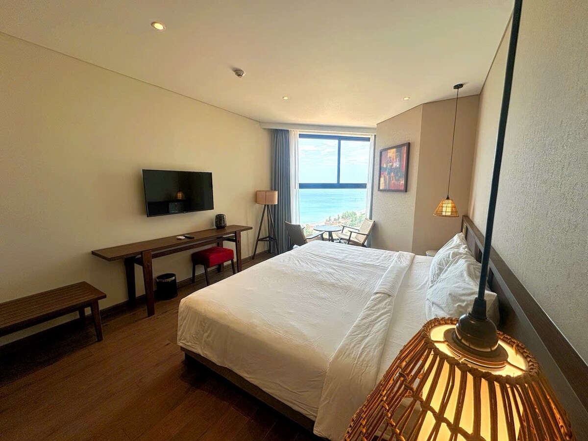 Căn phòng nhỏ thu nhỏ cả Muine trong tầm mắt… Bạn chỉ cần ra khỏi phòng, xuống nhà là có quán ẩm thực và đồ uống trong khung cảnh tuyệt vời của biển và hồ bơi vô cực đẹp nhất Phan Thiết. Với xe điện đón tại sảnh bạn sẽ dễ dàng di chuyển xuống bãi biển, hoặc bạn thả bộ, đi thang cuốn xuống bãi biển cát trắng mịn màng. Dịch vụ khách sạn chỉ mua khi dùng: gym 55k/phòng, hồ bơi 130k/phòng, sauna&gym&hồ bơi 150k/phòng. Bãi biển miễn phí thoải mái tắm nắng đi chân trần trị liệu trên cát.