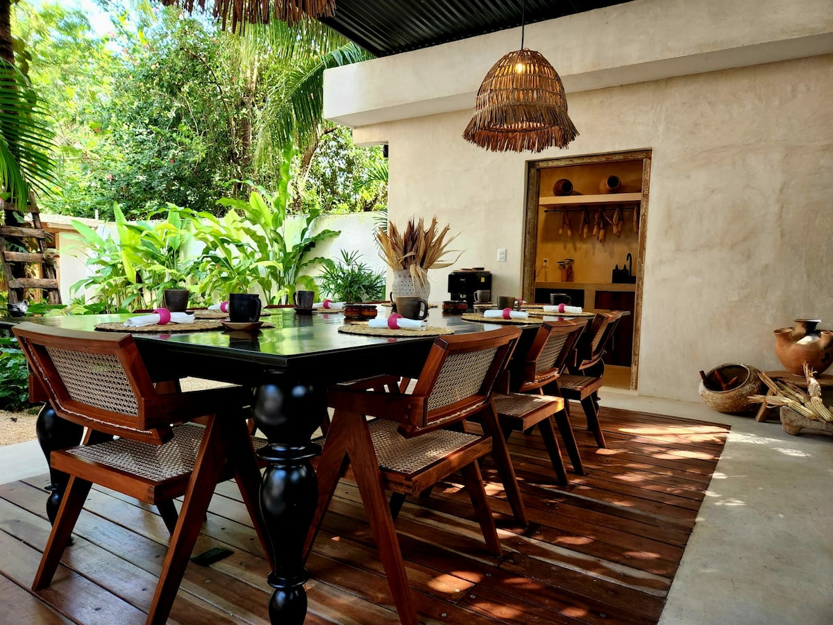 The villa is surrounded by majestic trees, exuberant plants and is located one block from the Lagoon. It has 2 rooms with AC and with independent entrance, they share a bathroom, kitchen, terrace, and garden. One room has a full-size bed, and the other a full + individual bed. There is a small outdoor kitchen with a mini-refrigerator and all the cookware for your comfort during the stay. The terrace is a typical palapa, it has an outdoor dining room, a wonderful garden with birds and trees.