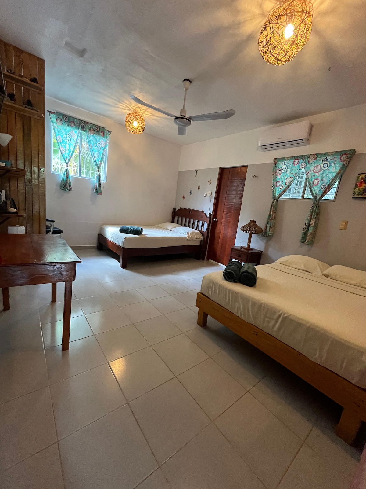 Beautiful comfortable room with all the amenities needed for a warm stay. It has a king size bed, 1 single bed, A/C, ceiling fans, smart TV with Netflix, HBO, Prime Video, minibar, coffee maker with coffee beans, WIFI, and its own bathroom. Laguna is just 3 blocks away, the market is 1 block away, and downtown is 3 blocks away. We have 3 bicycles included in the room rate and a full shared kitchen.