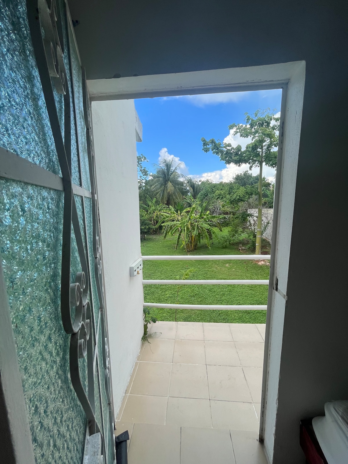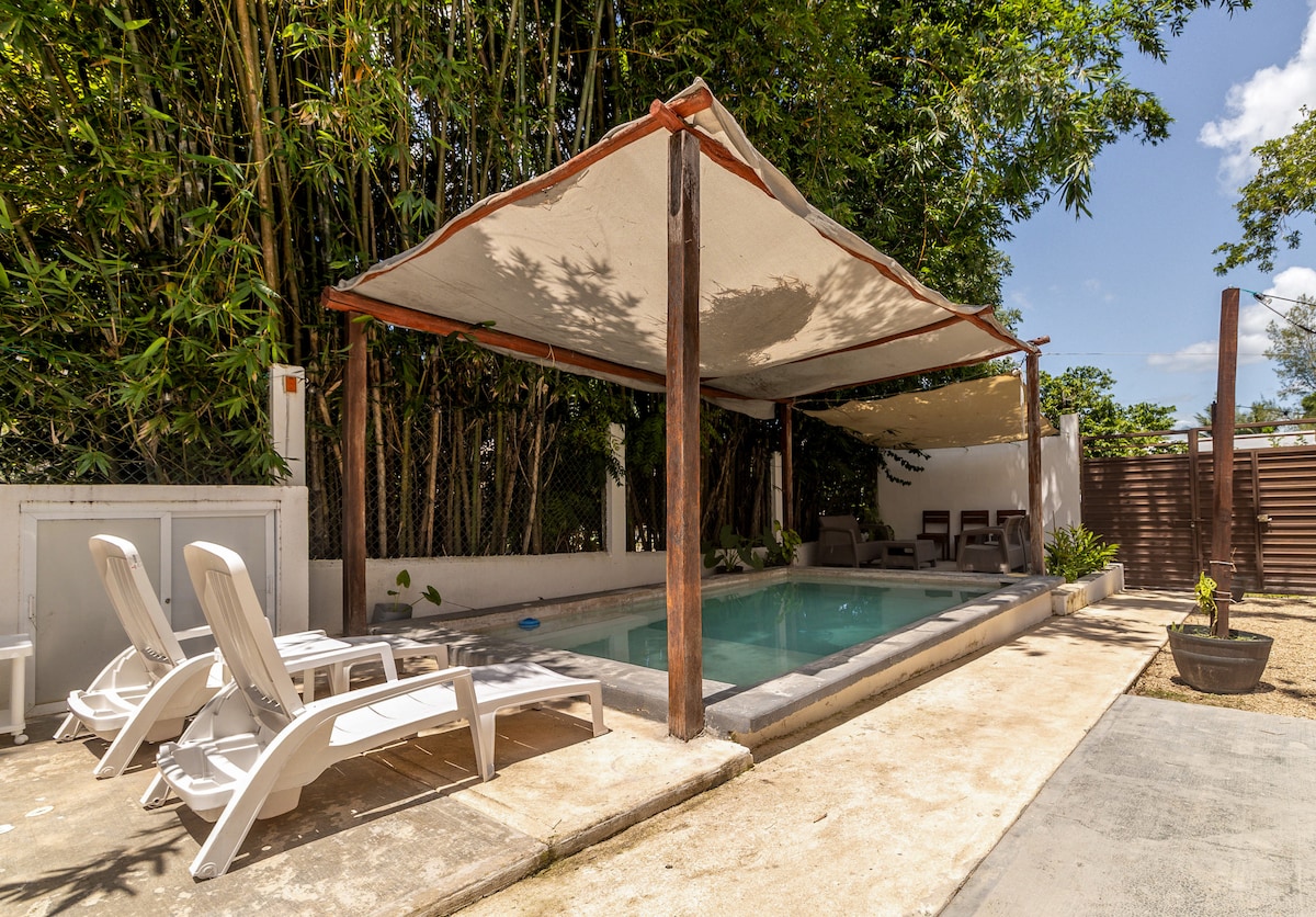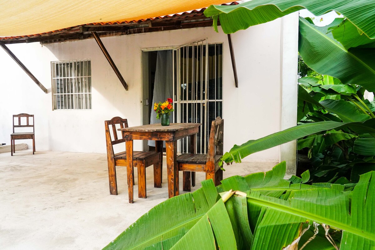 Apartment with separate entrance inside a country house, surrounded by trees and farm animals (chickens and 4 dogs). The room has a king size bed, hammock, private bathroom, TV with Roku, AA, internet and its own kitchen with stove, coffee maker, refrigerator, blender and dishes. The space is located a few meters from the lagoon and the bus terminal (ADO). The property is completely safe and has a large garden area and parking.