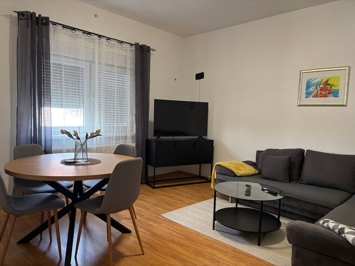 Completely renovated APARTMENT in Vinkovci. Equipped with: - kitchen (oven, fridge with freezer, microwave, cooker) - living room (air conditioning, sofa bed, balcony exit, Smart TV, free WiFi, Netflix) - bathroom (walk-in shower, washing machine, hair dryer, towels) - bedroom (comfortable double bed, Smart TV) Self check-in and check-out - privacy guaranteed. Close to shops, cafes, restaurants, city center (5 min), train station, free parking.