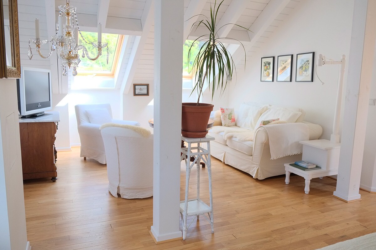 The whiteloft is one of our top locations that we have been offering on Airb&b since Oct 22. The loft is about 130 square meters, ceiling height 5.5 meters 50% of the area is designed for wellness & living only. Bathtub, daybed, 2-person spiral shower and Real wood fireplace leave nothing to be desired. In summer, a 5 x 4 meter gate can be opened which makes the lower loft area a convertible. The large kitchenette and the block are suitable for events A wine refrigerator, 4 gas burners and a ceramic stovetop are included