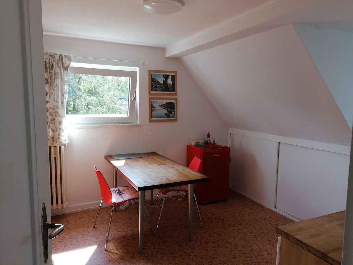 Welcome to my cozy attic apartment! Immerse yourself in the charm of the oldest house in Plittersdorf. Whether an evening walk or enjoying nature, the immediate proximity to the Rhine offers a true relaxation factor. Nevertheless, be well connected: In just 15 minutes by bus to Bonn main station Culinary travel: There is a small and delicious French restaurant right in the house. I look forward to meeting you!