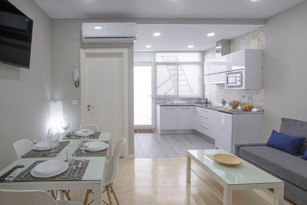 A 28-square-meter apartment located on the first floor of the building overlooking Plaza de España, with air conditioning, heating, Wi-Fi, refrigerator, microwave, glass-ceramic stovetop, 50-inch TV, hairdryer, dishwasher, towels, shampoo, gel...