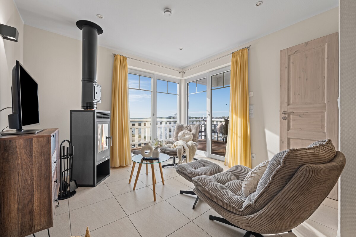 The three-storey beach house has more than earned its name, as it is really right on the beach/ sea. A unique location in the Baltic Sea resort of Olpenitz. In addition, there is a large roof terrace with water views. The whirlpool bathtub and sauna (with Baltic Sea/beach views) are great for unwinding. The fireplace in the lounge room and underfloor heating provide warmth and coziness on cold days.