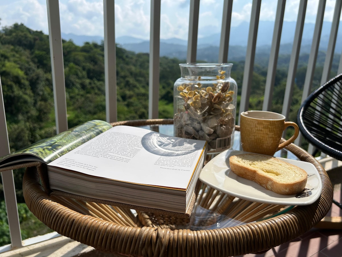 "Suite among the trees", designed by the artist Denis Aleksandrov. Queen bed, social area, equipped kitchen. At 1700 meters, on top of the hill, the author's house offers panoramic views towards El Tablazo and the valleys of San Francisco, La Vega and Gualivá. With luck, you'll see Los Nevados Park and the fumarole of the Nevado del Ruiz volcano. Warm weather and cool nights without mosquitoes.