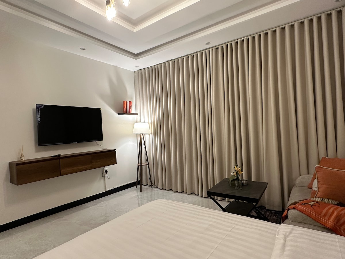 ✨Every corner of the studio is designed to make you feel at home ✨ ✨We promise that what you see in the photos is a reflection of reality ✨ Enjoy a hotel experience Studio Specifications: • Master bedroom ( king bed ). • Sterile toilet. • Self-entry is easy and secure . • Soundproof . • Luxury hotel mattresses covering the entire unit . • Long mirror and dressing area. • Manual steam ironing. •Mini fridge . • Coffee Corner. •Paper-roll wipes for the bathroom . • Hair dryer . • Very high internet (fiber optics) . • Smart screen with free subscription to Witness Netflix, over 30,000 channels, movies, and series