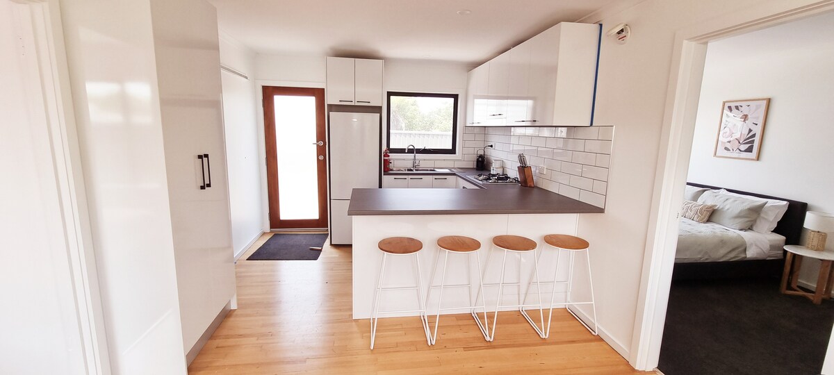Gillys is a modern 2 bedroom stand alone guesthouse situated in a quiet street. The guesthouse sits on the sheltered and private side of the main residence and one acre site, overlooking large trees and gardens. Enjoy the peaceful aspect, gaze at the stars at night and listen to the distant waves crashing on the Ninety mile beach. Metung village is only a short 8 minute drive away for your closest supplies. There is a public nature track which leads to a lakeside beach and private jetty.
