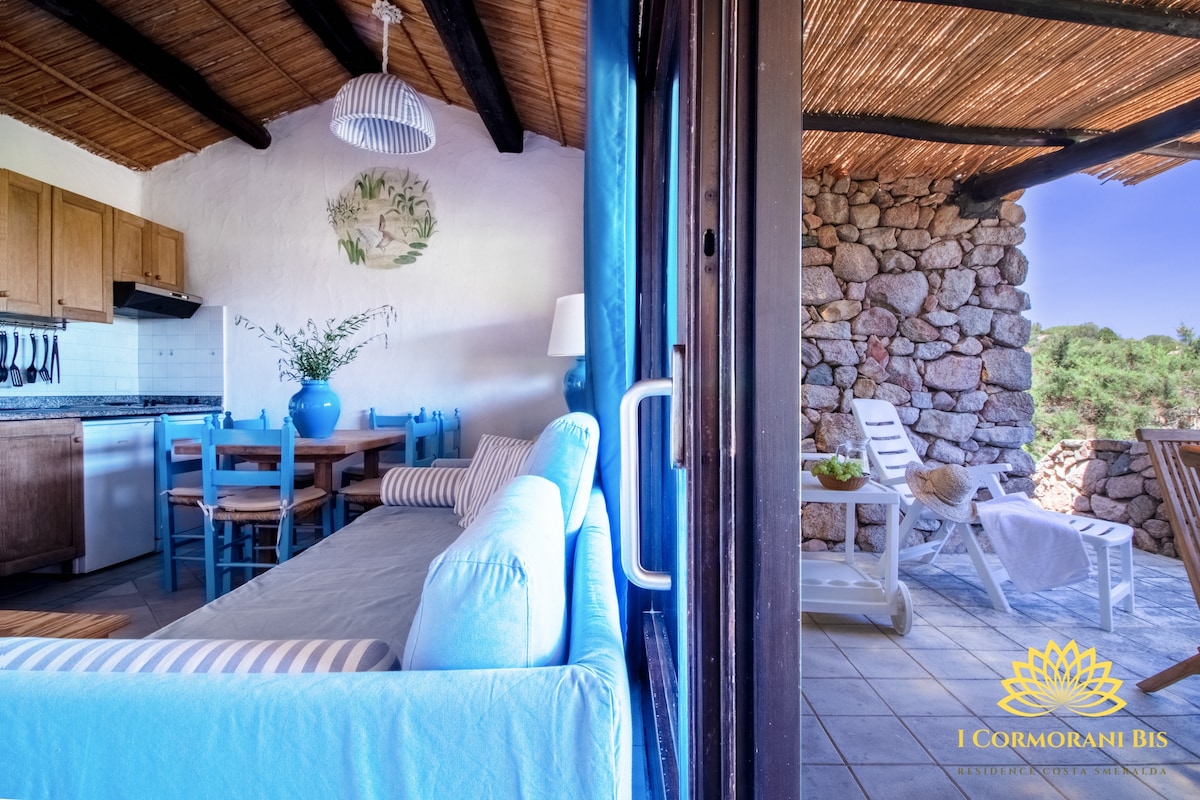 In posizione panoramica splendida porzione di villa bifamiliare, con vista mozzafiato sul mare della Costa Smeralda. Le grandi vetrate danno contiguità tra interno e esterno per godere degli spazi in e outdoor arredati con gusto. Il soggiorno open space ospita anche la cucina attrezzata. Dispone di due camere matrimoniali con bagno. Si distingue con arredi moderni e di carattere