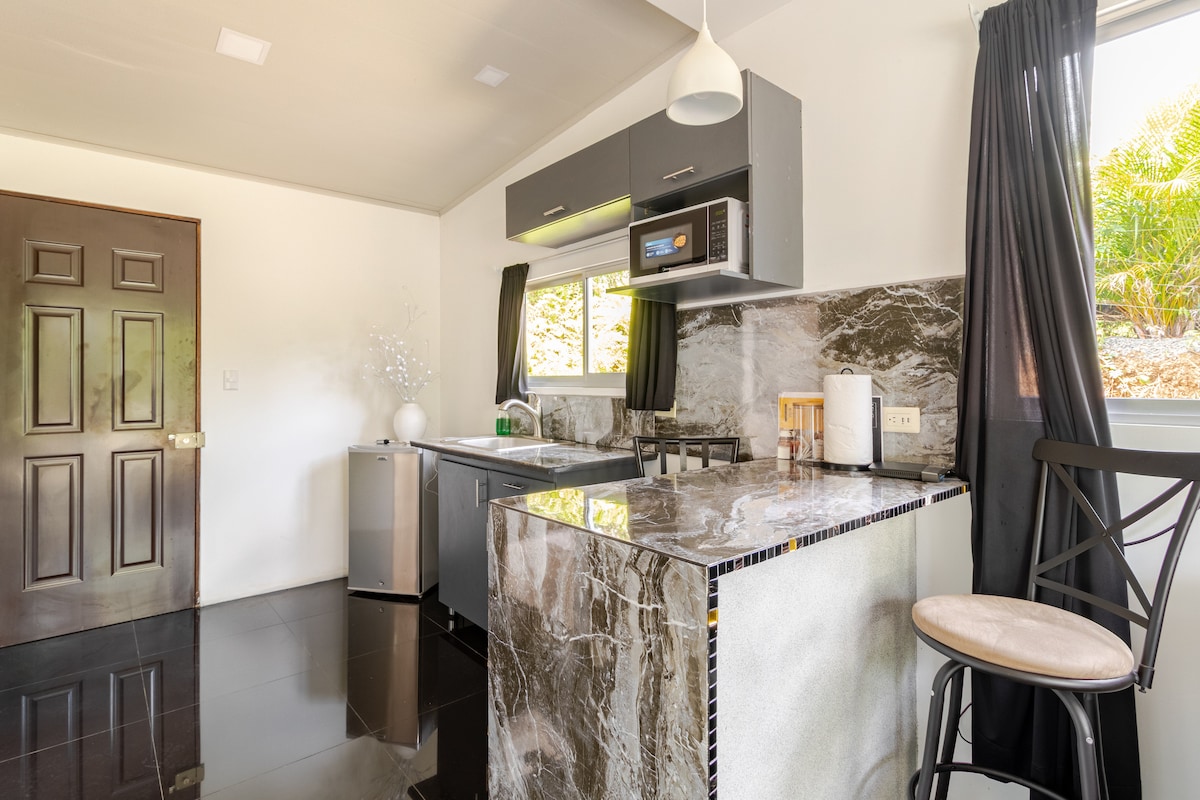 Kick back and relax in this calm, stylish space. This bungalow is just 40 min away from the most tourist town of the Area , La Fortuna. In a secluded an private area with a beautiful view of the rainforest and the Arenal Volcano. The bungalow is very comfortable and perfect to relax.. while just 5 min away from Santa Clara where you can find restaurants, supermarkets and cafeterias. This bungalow offers a very spacious deck and outdoor kitchen perfect to do yoga, sunbathe and enjoy the views
