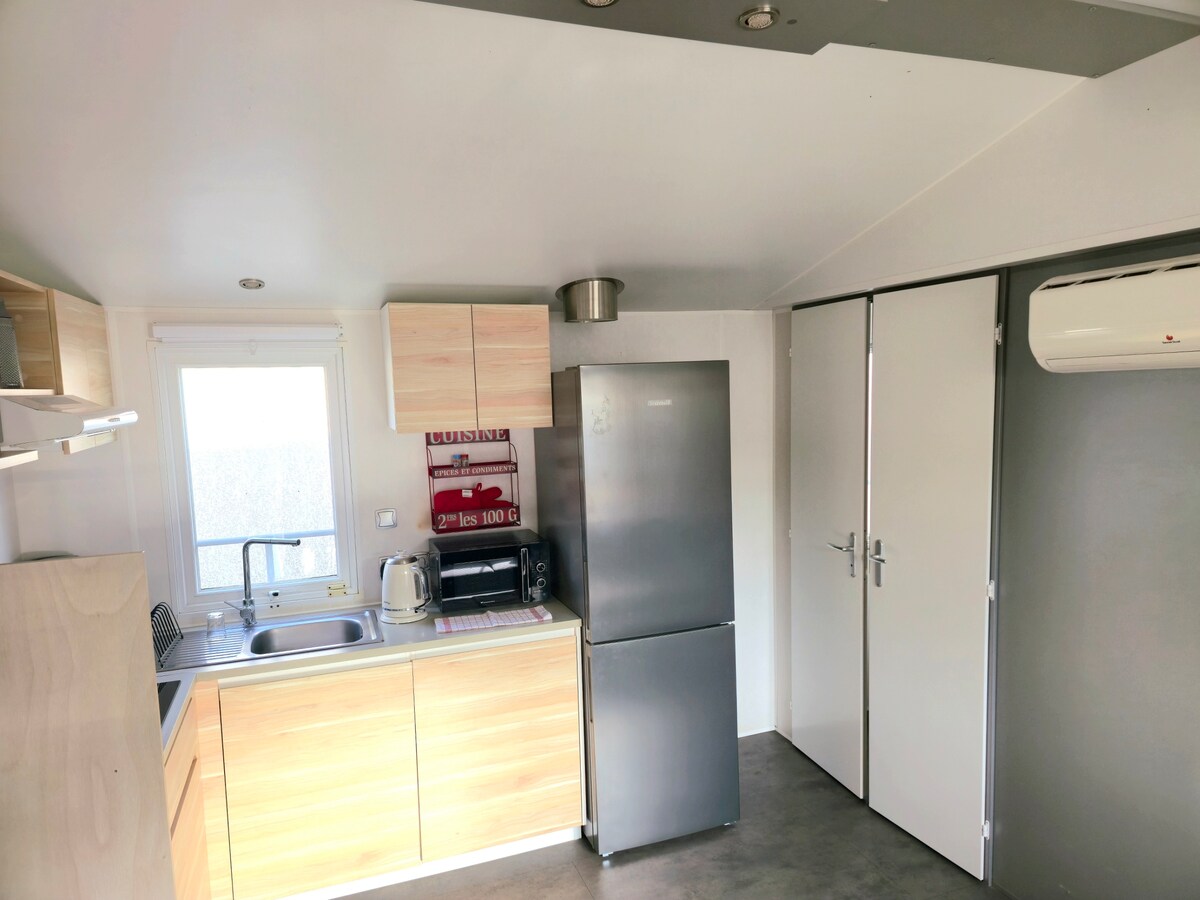 This family home is close to all sights and amenities. 33 m² mobile home with gable terrace, ideal for 4 people, consisting of four rooms: Dining room with equipped kitchen, shower room and two bedrooms side by side. (A master bedroom with a double bed and a second with two single beds) Outside there is a covered wooden terrace and garden furniture.