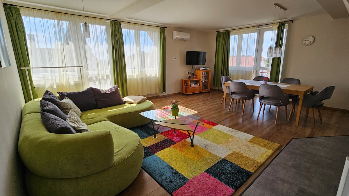 Lean back and relax in this new, perfectly equipped, stylish place and spacious garden! The Champagne Apartment is a quiet, close to nature and discreet home, from where you can reach the center of Balatonfüred and the shores of Lake Balaton in a few minutes. Perfect for hikers and cyclists. The stairs to the gallery are steep, so come with children who are not yet climbing or are already climbing safely. I provide a travel bed, baby bath, changing mat, and high chair for babies.