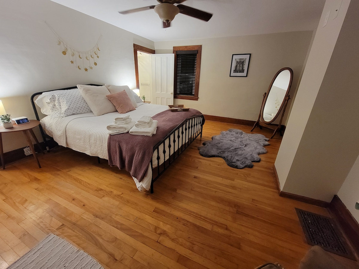 Step back in time in time as you enter the first-floor George Washington Suite in this 1790 historic home in Baldwinsville, NY. Period furniture blended with modern amenities provide for a luxurious stay. Park directly outside your suite and private front entrance. From your living room, step out onto the grand, columned back porch and stroll through the peaceful gardens. Sip your morning coffee on the patio beside the fountain or under the pergola while enjoying the gas fire pit.