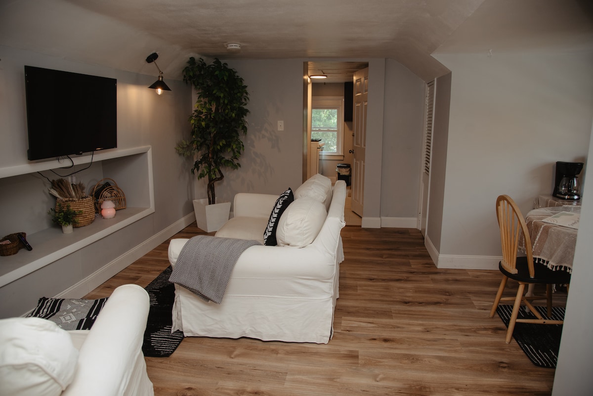 Kick back and relax in this calm, stylish space. Perfect for a romantic getaway or work retreat, this recently renovated apartment embodies a fresh boho feel with vintage soul. Enjoy the beautiful view out the large picture window, cooking in the adorable and functional kitchenette, or relaxing in bed by the gas fireplace. Located in Auburn's historic district and a 1-min. drive from Wegmans. From here you can easily access downtown shops, restaurants, and attractions by foot.