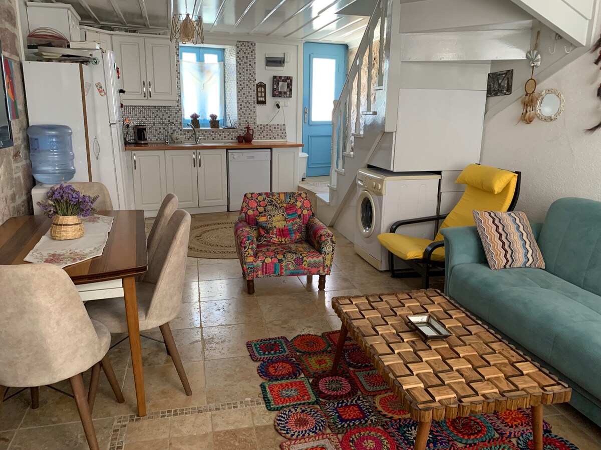 Offering different experiences to its guests during their stay and newly restored, the house will give you peace and make your holiday unforgettable with its original decoration. The upstairs bedroom is furnished with antique walnut furniture. The mezzanine floor is a lovely bathroom, and the ground floor is the living area. The open kitchen island turns into a table when desired. When the giant door is opened, it turns into a street view. The house has been restored without compromising its originality, those who seek extreme hygiene may not be satisfied. It will provide you with an experience like Cappadocia cave rooms.