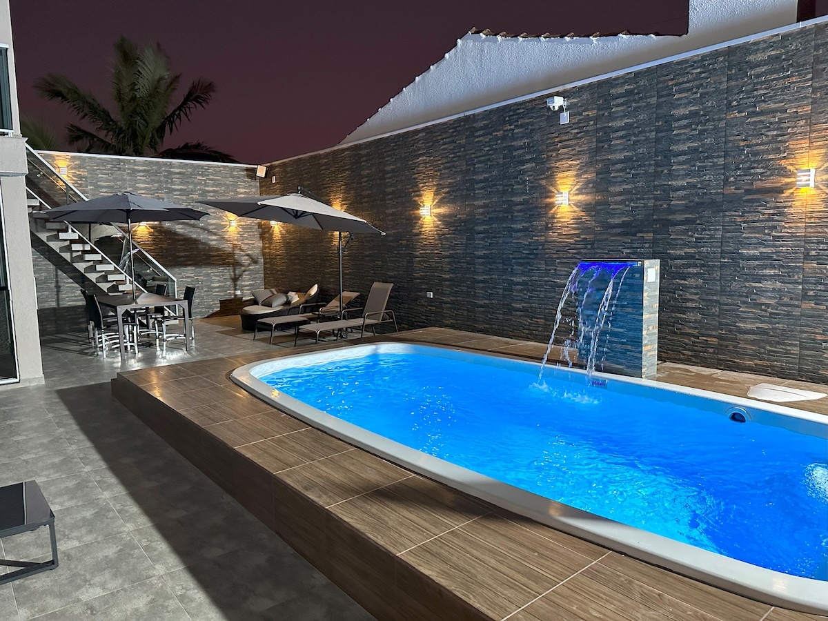 Relaxe com toda a família nesta acomodação tranquila. casa com piscina grande e uma duxa externa/chuveiro, fica a 130 metros da praia, 2 quartos, sendo o maior com ar condicionado e o menor com ventilador, sala com TV e Netflix, estacionamento no quintal, 2 banheiros . wifi, área de churrasqueira, cozinha completa com forno, micro-ondas etc...mesa na area de festa com 12 lugares ,permite animais pequenos, 2 redes espreguiçadeira . sinuca cobrado a parte
