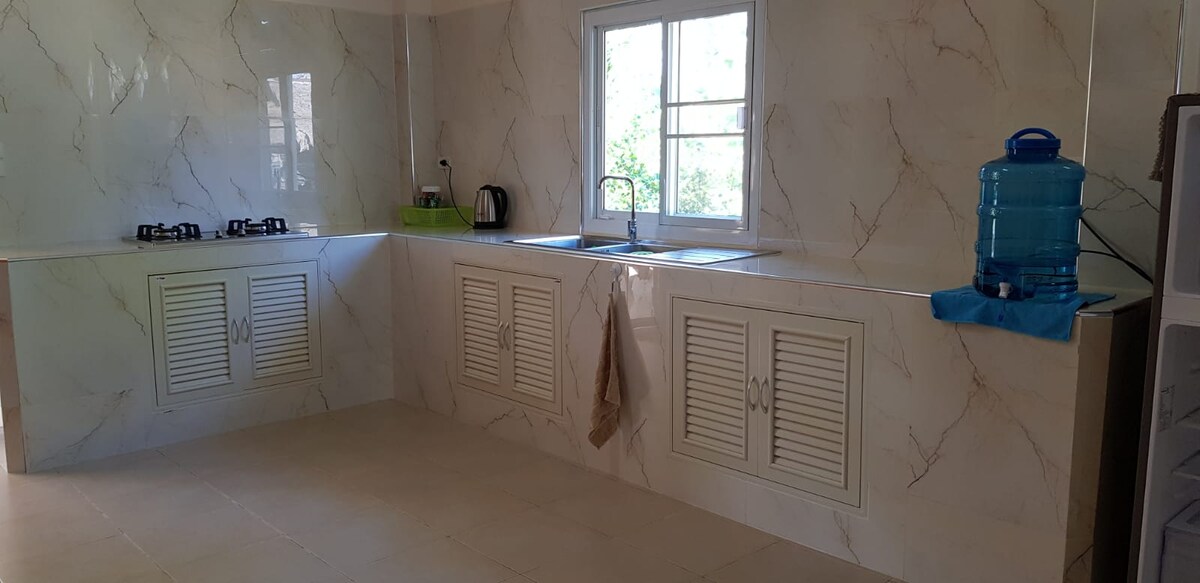 The house is equipped with sufficient lighting and electrical outlets. The large veranda is equipped with lighting and an outside shower with toilet. The kitchen is fully equipped including a fridge, gas stove and cooking utensils. You can't drink water, but around the corner you can buy 10 liter bottles in the store.