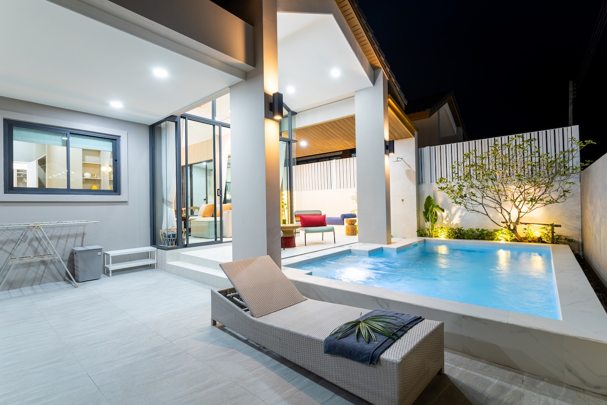 This brand new Y2 villa in Phuket is a 500 sqm garden view villa with a huge swimming pool, 4 bedrooms and 5 bathrooms. I'm sure you'll love it at first sight. Upon entering the villa, you'll find that the decoration and design are simple and modern, newly renovated, very clean, refreshing and comfortable. Each room has its own toilet and bathroom, providing comfort and privacy. The spacious kitchen is fully equipped to meet your cooking and dining needs. Outside the villa, the huge swimming pool is beautiful and elegant, making you feel like you are in an exotic setting, and feel more comfortable. Step into the courtyard, the bright and elegant atmosphere comes face to face, there is the fragrance of the soil, the lushness of the grass, and the leisure of the beach chairs. Everything is naturally elegant and subtly beautiful, adding a lot of poetry and painting to this villa. And when night falls, under the lights of the swimming pool, the entire villa is extraordinarily charming. Dine at the outdoor tables and chairs, with the music playing, have a drink with friends, it's wonderful! Here, you can enjoy a quiet and private vacation, get rid of the hustle and bustle of the city, and fully enjoy the beauty and blessings of nature. This is the endless happiness that staying at Y2 Villa in Phuket brings you! Relax and enjoy.